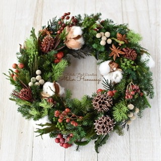 ナチュラルな木の実や色んなコニファーのプリザーブドクリスマスホーリーリース25㎝ | アトリエ花うさぎ