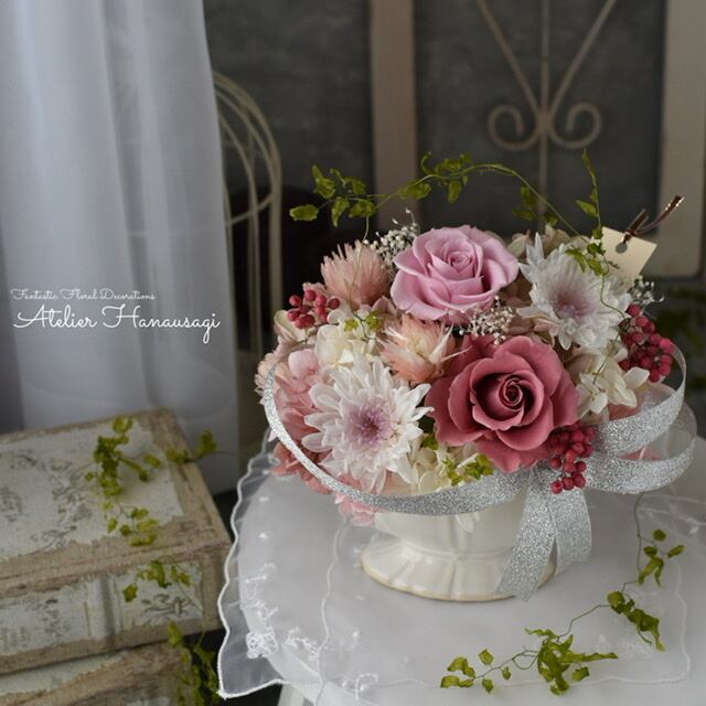 ◆使用花材 バラ・スプレーマム・紫陽花・ペッパーベリー・蔦・シルバーデイジー・カスミソウなど (プリザーブドフラワーと一部ドライプランツ)
