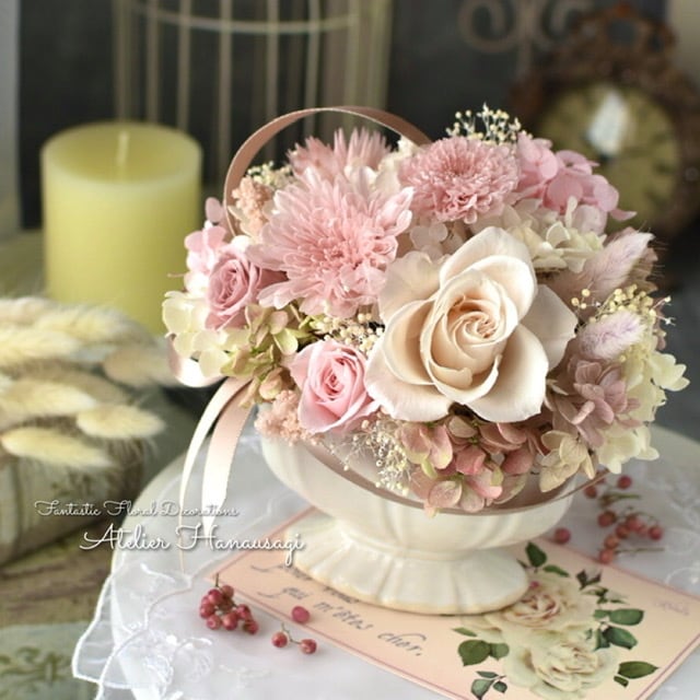 みずみずしくて、まるで生花のように思わず触りたくなるようなプリザーブドアレンジです。