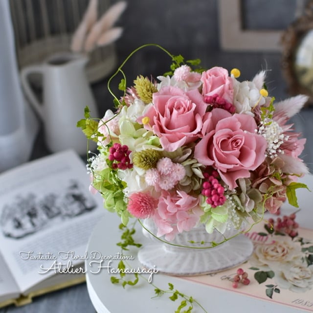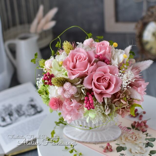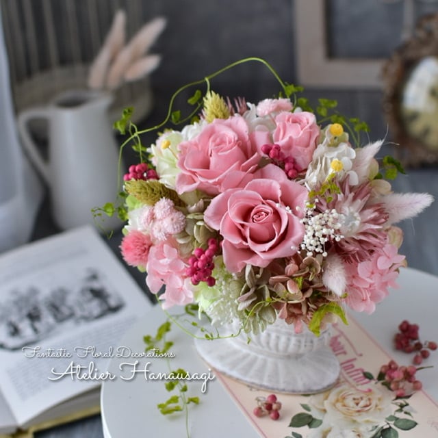 ◆使用花材 薔薇・ミニ薔薇・高級アンティークアジサイ各種・ペッパーベリー・蔦・シルバーデイジー・カスミソウなど (プリザーブドフラワーと一部ドライプランツ)